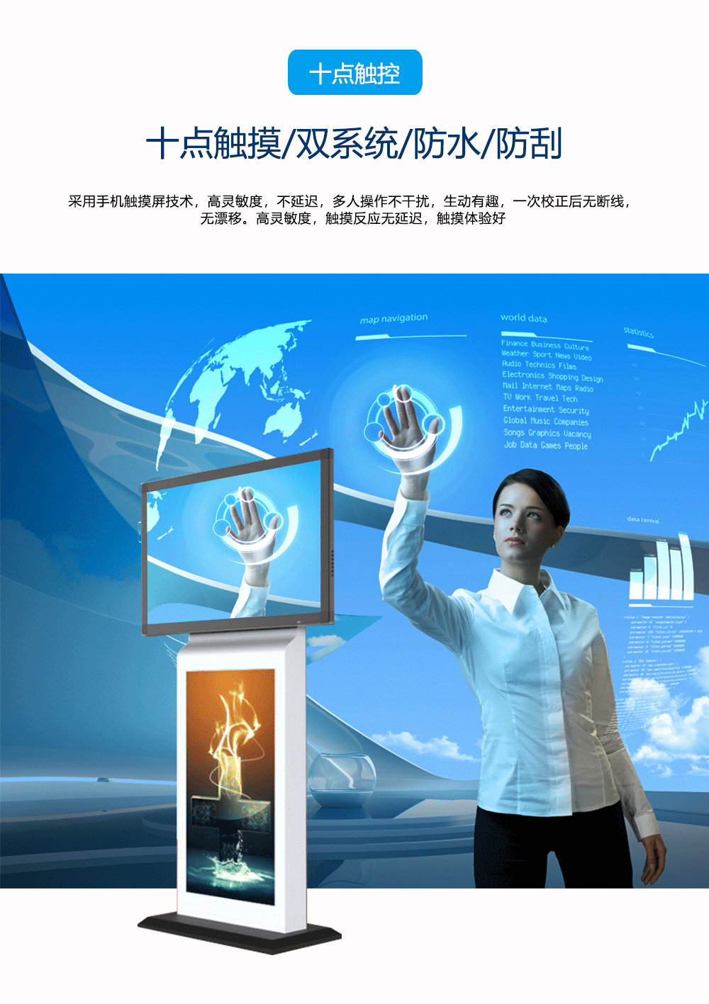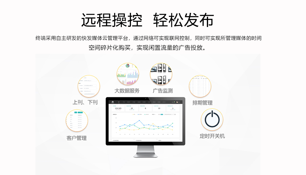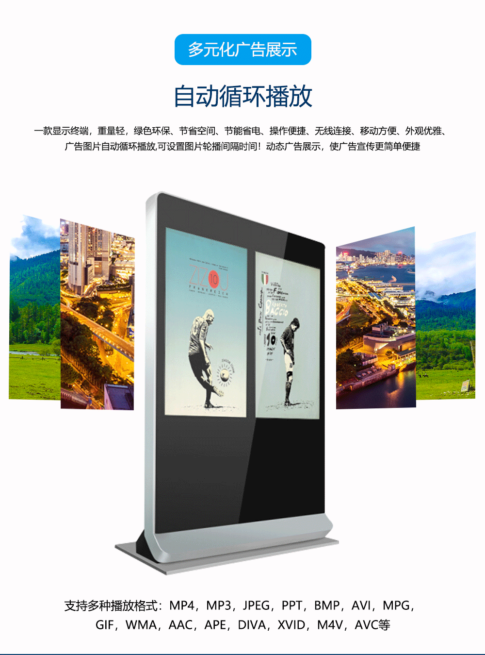 户外立式/落地式智能多屏互动广告机 亮度高达2000CD/M2以上,强光下可视,高清晰 度,液晶屏分辨率:1920x1080,采用直下式LE D背光源,亮度更加均匀,寿命达100000小时, 环保节能。动态对比度高,显示画面更清晰,亮度 无衰减。 1,钢制柜体,防水,防锈,防静电强度高 2,机身钢板,稳如泰山,采用工控正压防尘轴流 风扇无噪音, 循环散热。 3,智能冷暖强排风温控系统,温控风扇系统自动 调节箱内温度高精密度过滤系统 大数据服务平台 拥有海量数据,精准人群定向,智能优化算法,轻 松投广告 远程操控 轻松发布 终端采用自主研发的快发媒体云管理平台,通过网 络可实现联网控制,同时可实现所管理媒体的时间 空间碎片化购买,实现闲置流量的广告投放。