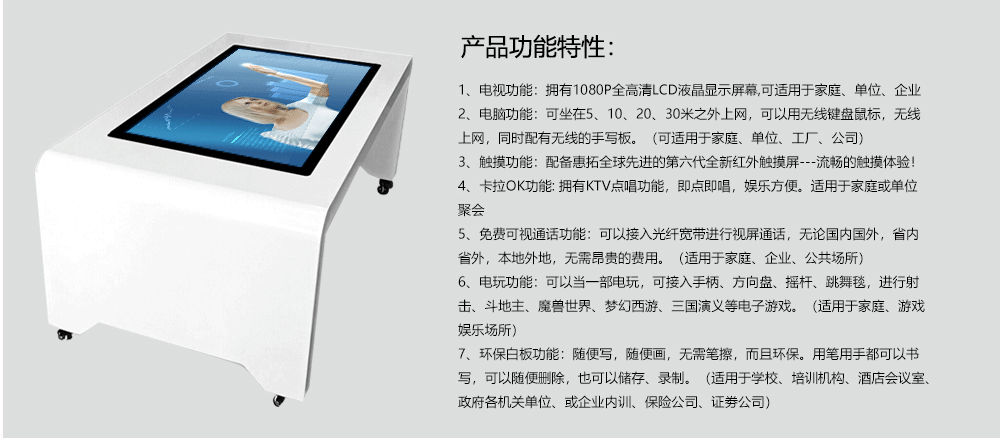 1、电视功能:拥有1080P全高清LCD液晶显示屏幕,可适用于家庭、单位、企业